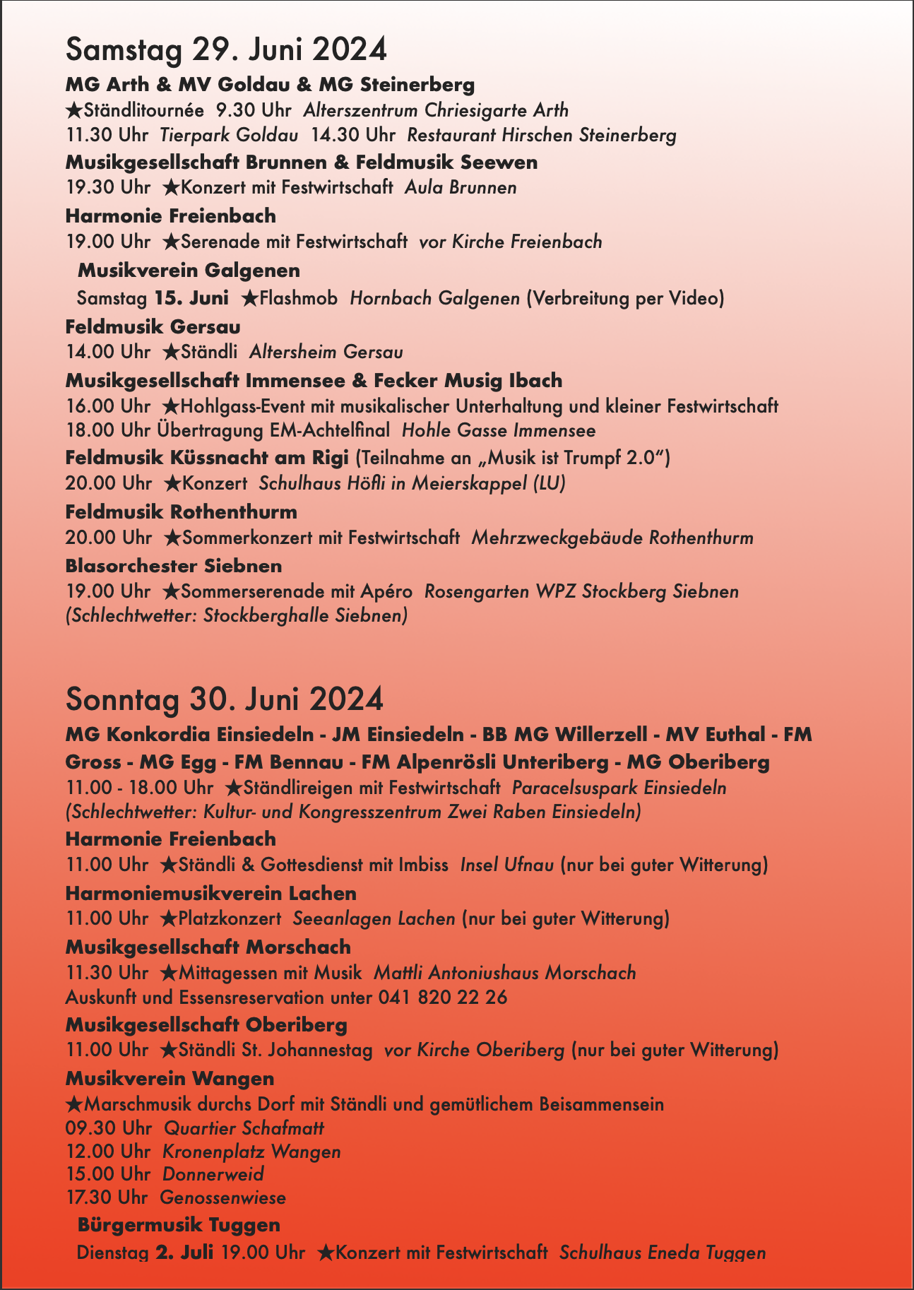 Sa.29Juni202416:00Hohle-Gasse, KapellplatzAnlass zum Wochenende der Blasmusik Kt. SZ ab 16.00 Uhr